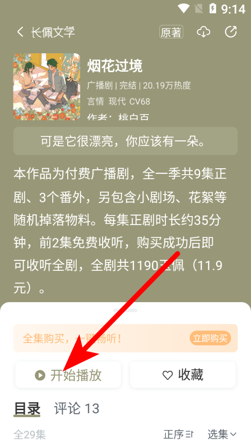 3、在作品详情页,点击开始播放按钮,进入听书播放界面。