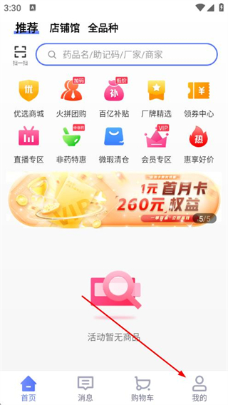 1、打开1药城app,点击底部导航栏中的我的选项。