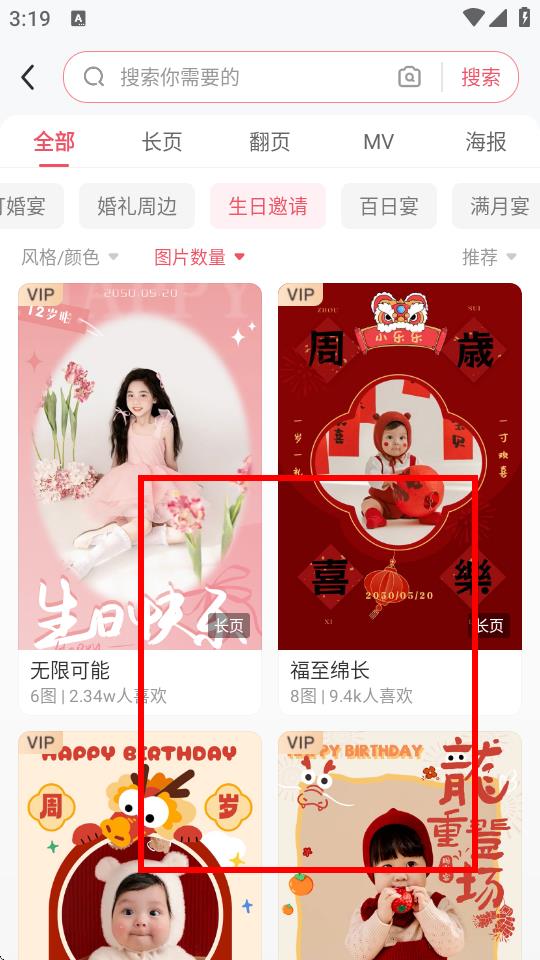 2、进入生日请柬模板页面,浏览众多模板,选择自己心仪的生日请柬模板,例如长页形式的模板。