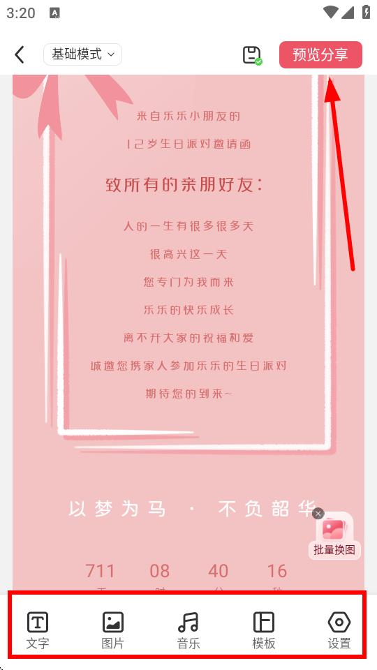 4、进入编辑界面,利用底部的功能,对请柬进行个性化定制,完成编辑后,点击预览分享,即可分享给好友。