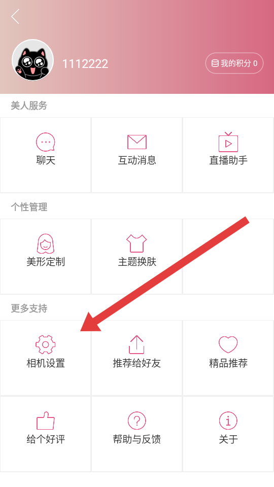 2、在个人服务页面的更多支持区域,点击相机设置选项,进入设置界面。