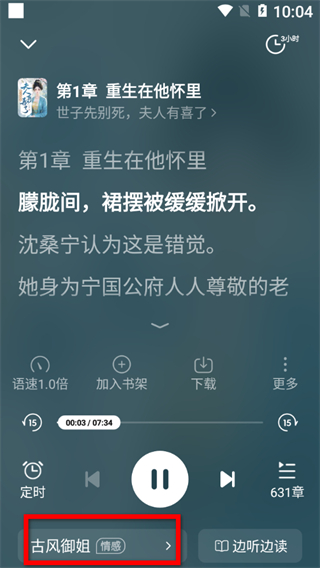 3、在听书界面,点击古风御姐选项,弹出切换声音列表。