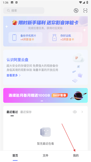 1、打开阿里云盘应用,点击右下角的我的选项。