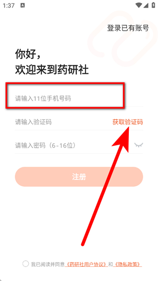 1、打开药研社,在弹出提示框,点击同意,进入欢迎页面。