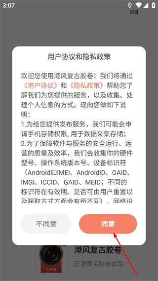 1、打开港风复古胶卷后,阅读弹出的用户协议和隐私政策内容,点击界面中的同意按钮。