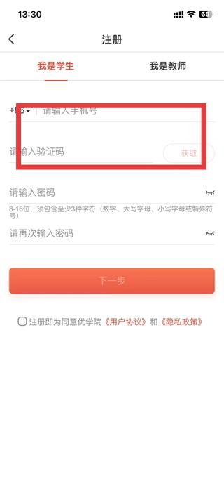 1、打开优学院app,在账号密码登录页面,点击注册选项。
