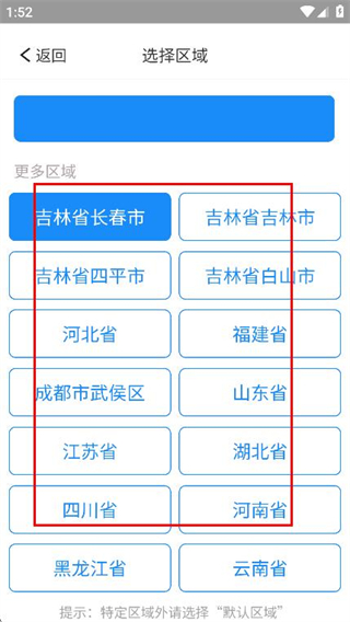 2、在选择区域页面中,选择区域,返回登录页面。