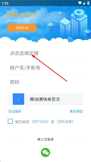 1、打开慧知行小学版,在登录页面点击选择区域。