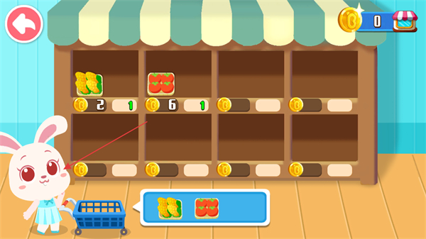 1、根据下方提示,从货架上选取对应物品如黄色蔬果放入购物车,开启采购流程。