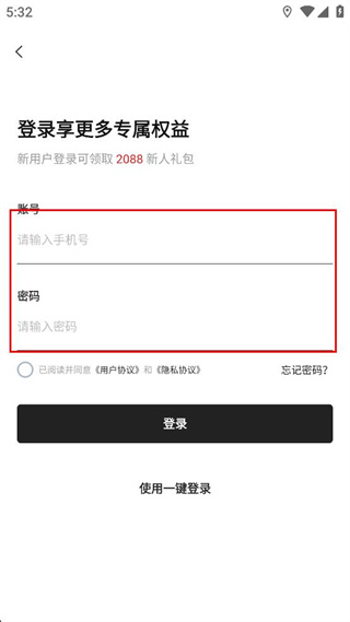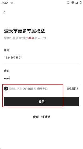 3、进入登录界面,在对应输入框填写手机号和密码信息,勾选相关协议内容。