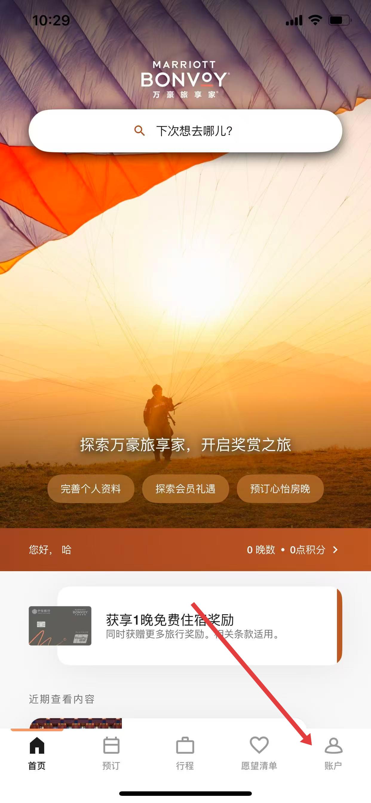 1、在万豪旅享家应用首页,找到底部的账户选项并点击,进入对应页面。