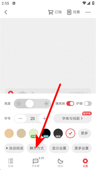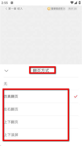 3、在设置菜单中,点击翻页方式选项,进入翻页方式设置界面。