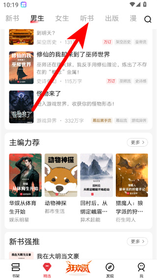 1、在起点读书精选页面,点击上方听书选项,进入听书专区。