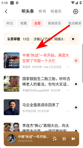 4、进入畅听页面后,即可选择头条号内容进行收听。