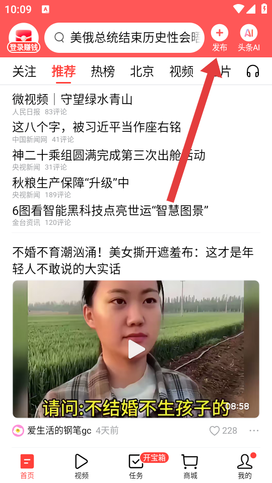 1、进入app首页后,在头条首页的顶部,需要点击红色发布的按钮,进入内容创作的编辑界面。