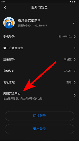 4、在账号与安全页面点击美图安全中心,进入美图安全中心页面后点击注销账号,按照提示完成美图秀秀账户的注销操作。