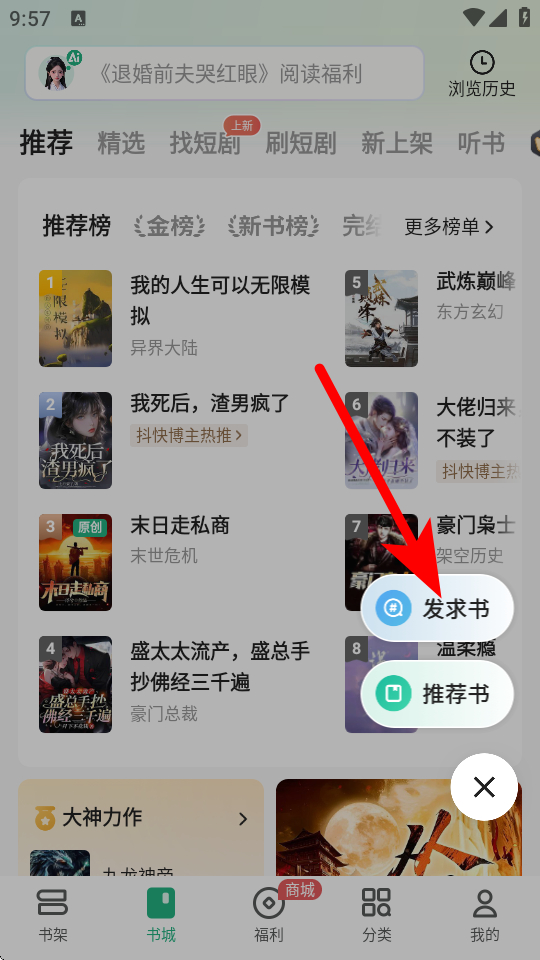 2、在书城界面的推荐榜等榜单中,挑选想听的小说,比如离婚后,我成了前妻高攀不起的神,点击进入小说阅读页面。
