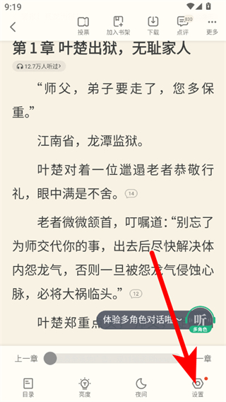 3、在小说阅读页面,点击屏幕右下角带有听字的圆形按钮,即可开始收听该小说,享受多角色听书体验。