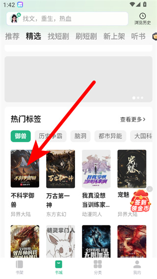 1、在书旗小说书城页面,找到并点击想要调整目录顺序的书籍,进入书籍阅读页面。