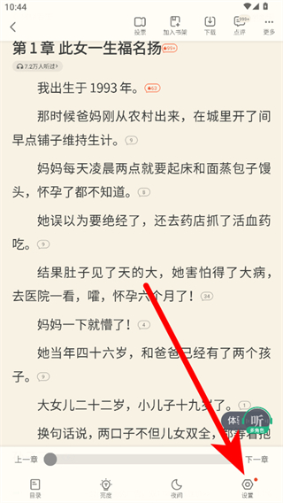 2、在阅读界面,点击右下角设置选项,展开阅读设置菜单。