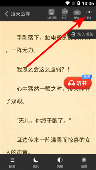 2、在书籍阅读界面,点击右上角更多选项,弹出功能菜单。