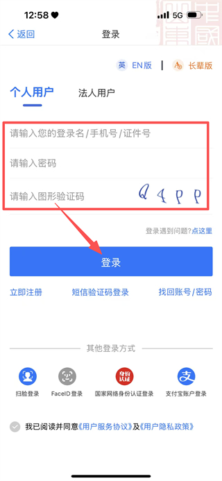 3、在登录页面,填写/手机号、密码、图形验证码,点击登录完成账号登录。