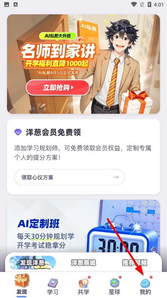 1、打开洋葱学园App,在底部导航栏中,点击最右侧的我的选项。