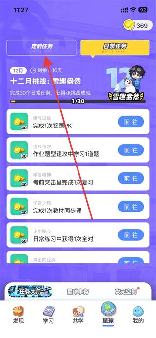 2、在星球页面中,选择并点击上方的定制任务板块。