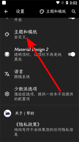 2、在设置页面,点击主题和稿纸选项,进入对应设置界面。