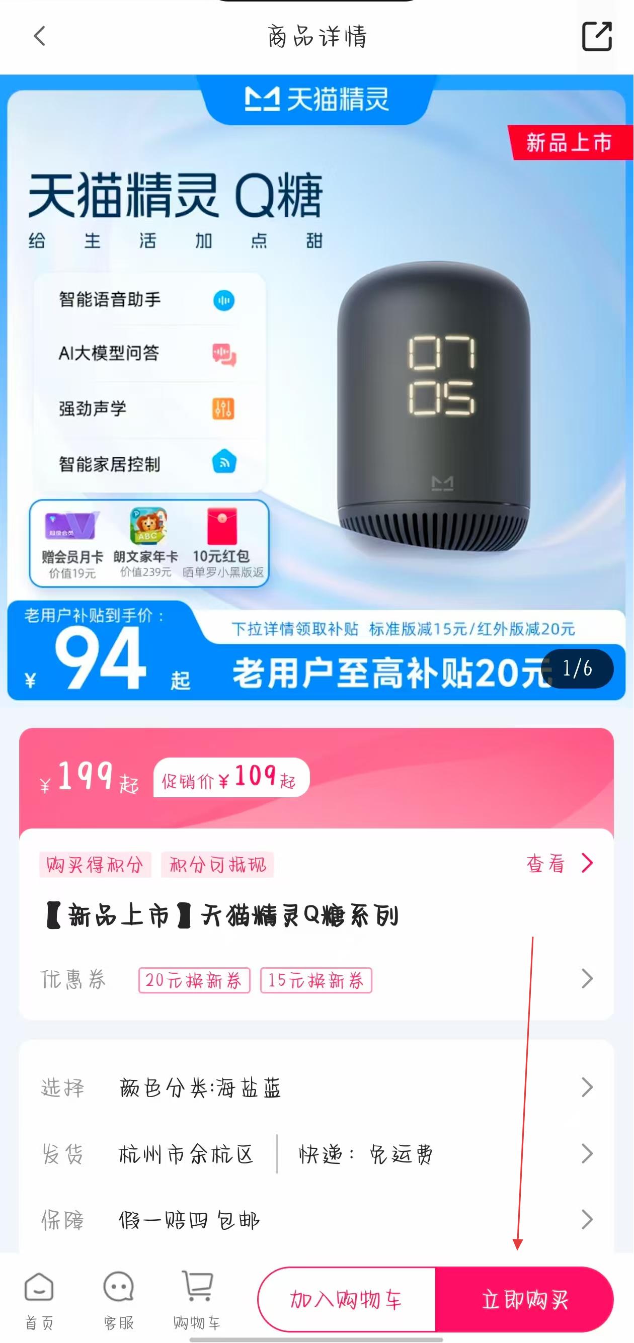 1、打开天猫精灵APP,进入商城页面,找到想要购买的天猫精灵设备,点击该商品进入详情页。
