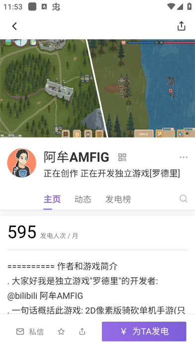 2、点击目标创作者的条目,进入其主页,可查看创作者的创作说明、动态等信息,了解发电档位及对应福利。