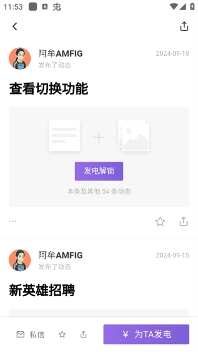 3、在创作者主页底部,点击紫色为TA发电按钮,选择发电档位并完成支付,即可支持创作者并解锁对应福利。