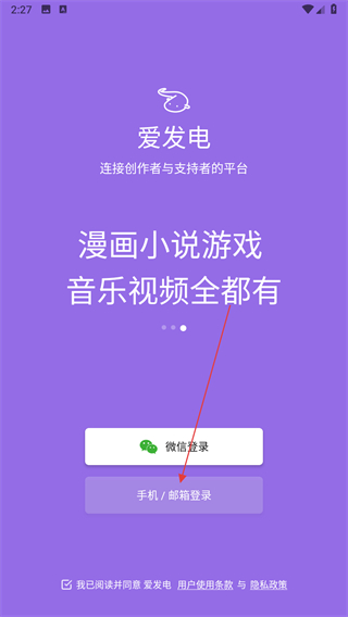 1、打开爱发电登录页面,点击手机/邮箱登录选项。
