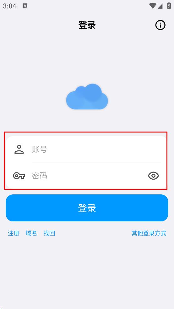 3、进入登录界面,界面有账号、密码输入框,还有“登录”“注册”“域名”“找回”等选项,在账号输入框中输入账号。