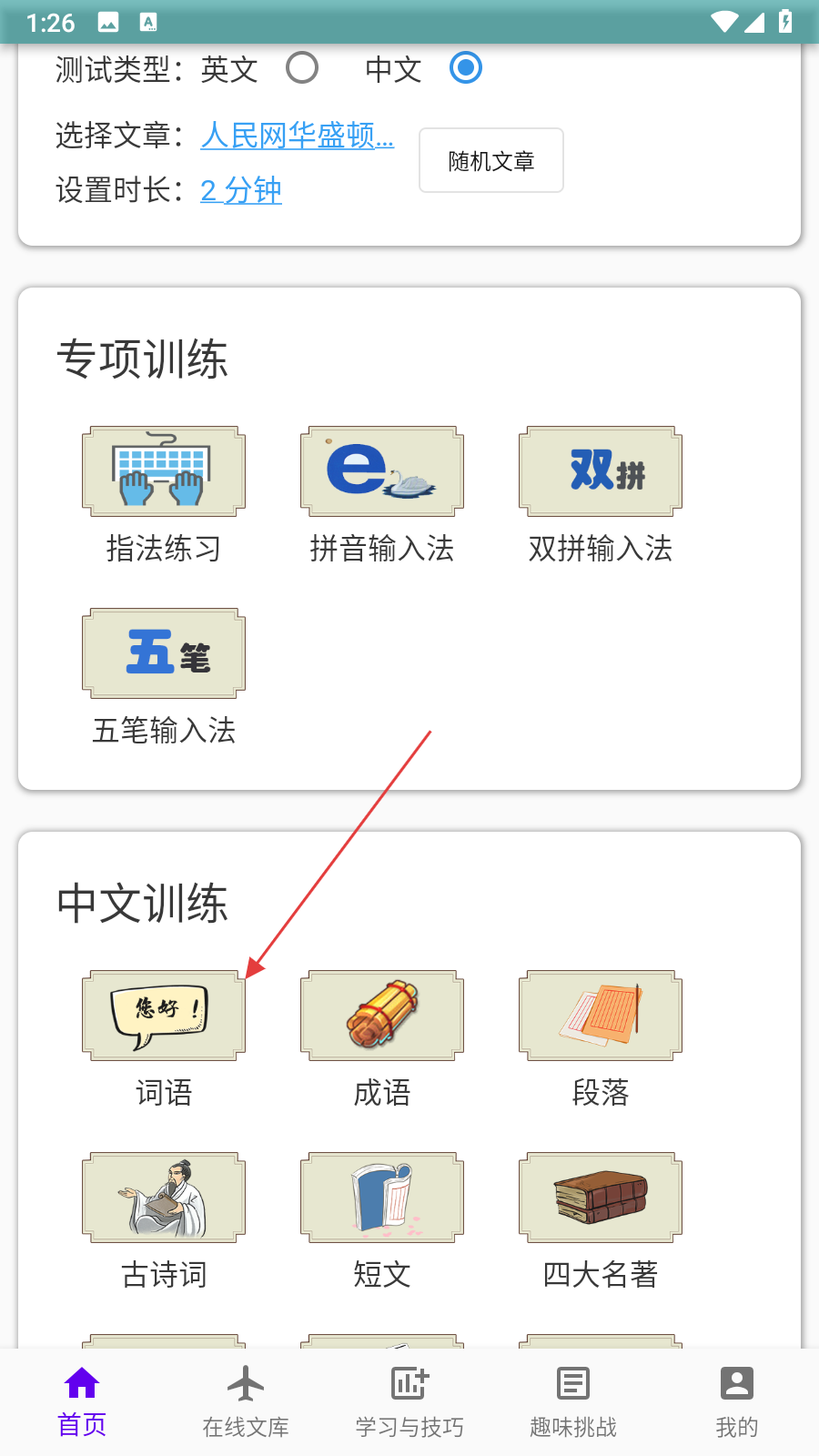 1、打开只语打字训练软件,在首页中文训练板块中,点击词语选项。