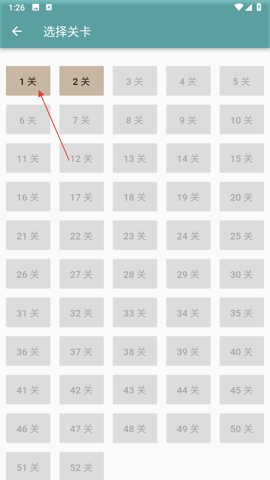 2、在选择关卡页面,点击1关,开启第一关的词语打字练习。
