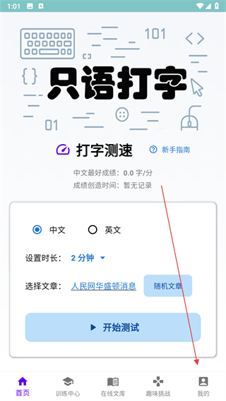 1、打开只语打字训练软件,点击底部导航栏的我的选项,进入个人中心页面。