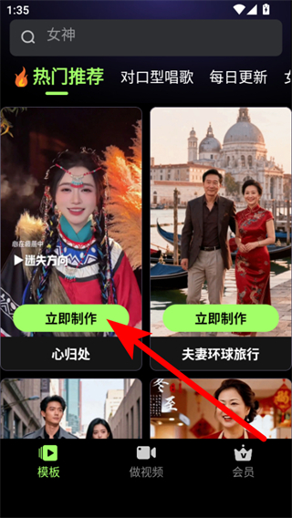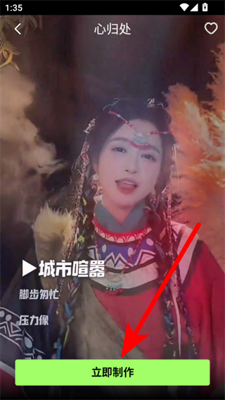 1、打开妙景APP,在模板页面选择目标视频模板如心归处,点击模板下方的立即制作按钮。