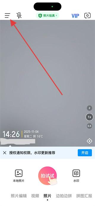 1、打开今日水印相机APP,点击左上角三条横线图标,弹出功能菜单。