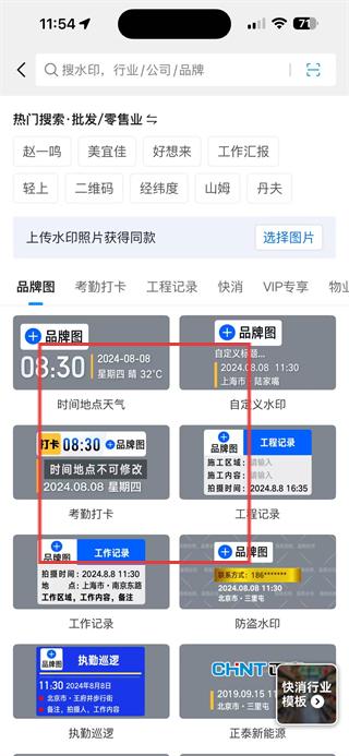 2、进入水印选择页,筛选出符合批发/零售业等行业需求的水印模板,如时间地点天气模板,点击编辑。