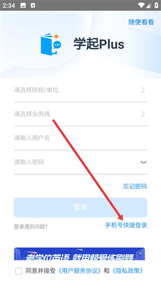 3、在登录页面,找到并点击下方的手机号快捷登录选项。