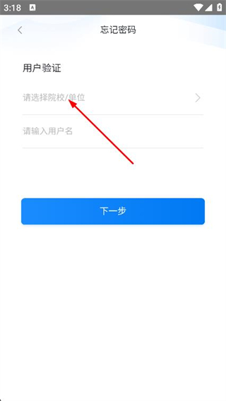 2、在忘记密码的用户验证页面,点击请选择院校/单位选项。