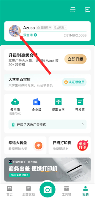 1、打开扫描全能王APP,点击右下角我的,进入个人页面。