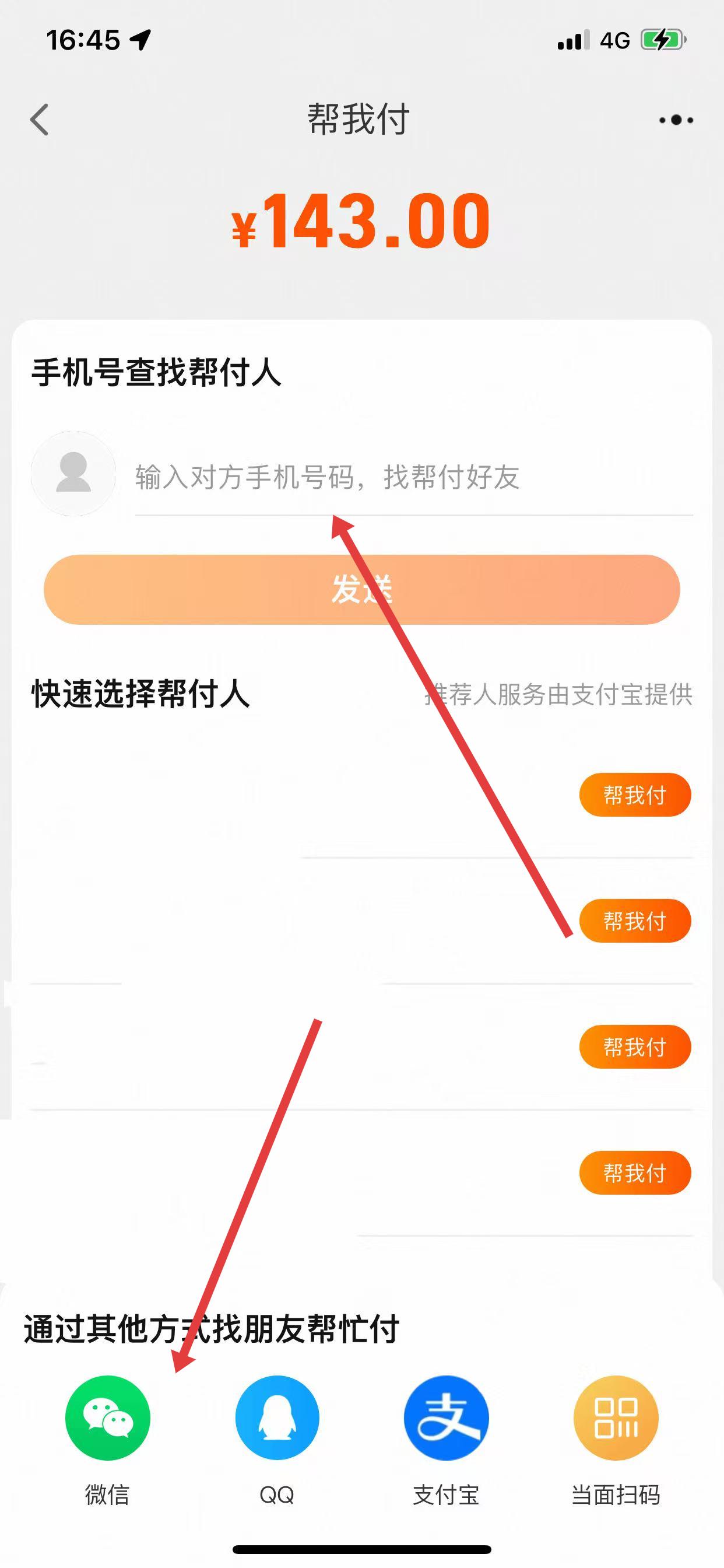 3、在「帮我付」页面,可以通过输入对方手机号查找帮付人,也可以点击下方的「微信」图标,将代付请求发送给微信好友,好友按照提示操作完成代付。