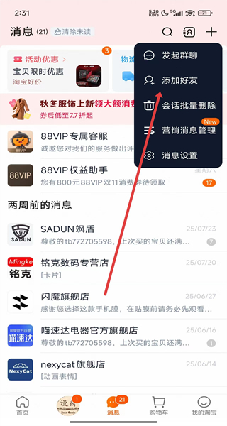 1、打开淘宝APP,点击底部“消息”,进入消息页面。
