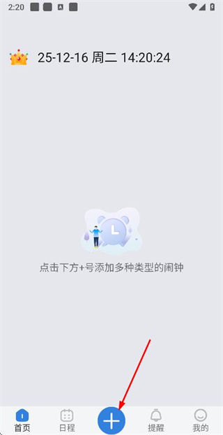 1、在首页点击底部的加号按钮,进入闹钟类型选择页面。