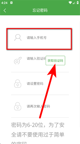 3、在忘记密码页面,输入手机号,点击获取验证码。