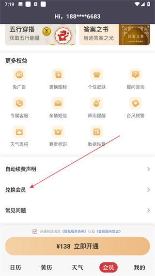中华万年历怎么兑换会员的