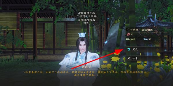 3、抵达任务目标处后,与对应的NPC交互,完成任务流程,点击完成按钮获取任务对应的奖励。
