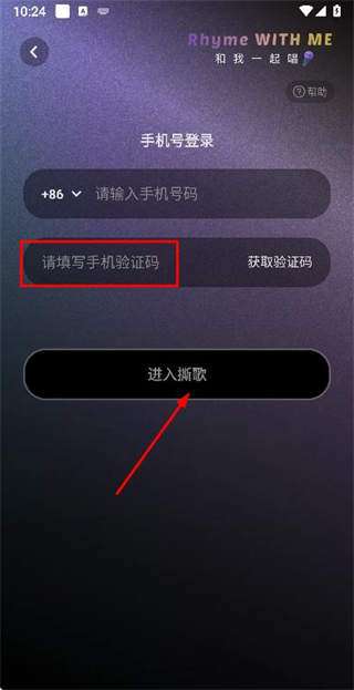 3、在验证码输入框中填写收到的验证码,点击进入撕歌完成账号的登录操作。
